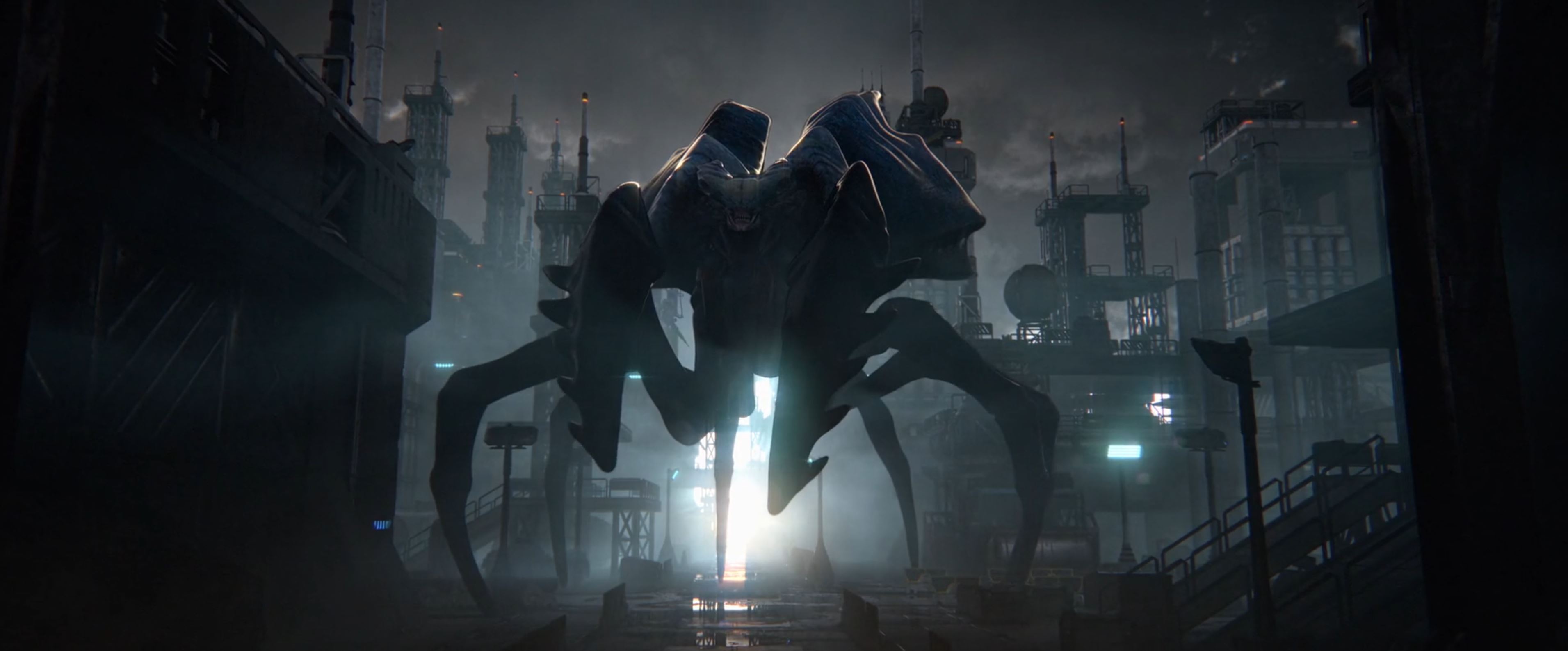 The work centered on a towering alien moving through an industrial cityscape, paired with detailed character moments designed to introduce the game’s world, scale, and emotional stakes.